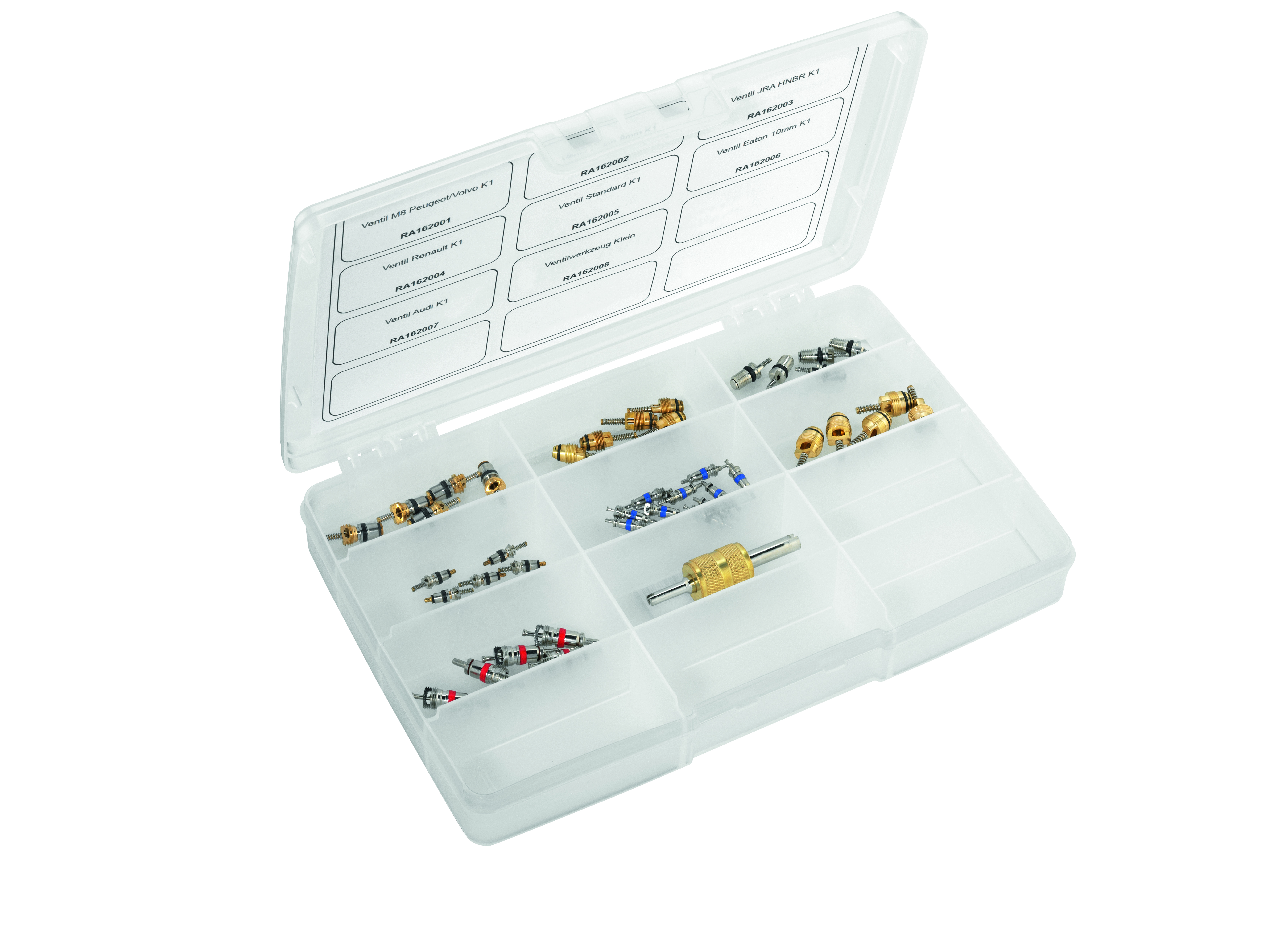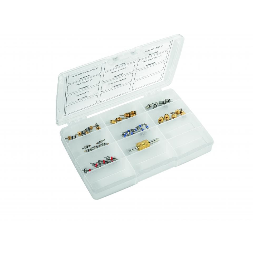 RA162000 SP00101681 Ventilkernkoffer universal Enthält einen Ventilkernschlüssel und die wichtigsten Ventilkerne zur Reparatur an Fahrzeug-Klimaanlagen mit dem Kältemittel R134a. Bilder: schrader_valves_kit_87605.jpg Category: Zubehör